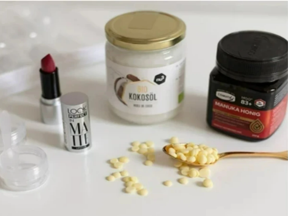 Der selbst gemachte Lippenbalsam besteht aus Kakaobutter, Kokosöl, Manuka-Honig und ein bisschen Lippenstift für die Farbe. Die Kakaobutter schafft die perfekte Konsistenz, das Kokosöl pflegt und spendet auch trockenen Lippen Feuchtigkeit, außerdem duftet es herrlich. Der Manuka-Honig wirkt wiederum antibakteriell und macht die Lippen schön geschmeidig.