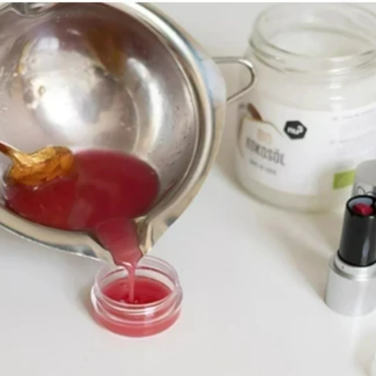 - Sind beide Zutaten komplett flüssig, kann eine Messerspitze vom ausgewählten Lippenstift hinzugegeben werden. Achtung: Dieser sollte neu beziehungsweise sauber sein! Man benötigt hier übrigens wirklich nicht viel. Den Lippenstift einfach etwas zerdrücken und dann einrühren. So viel hinzugeben, bis die gewünschte Farbintensität erreicht ist.