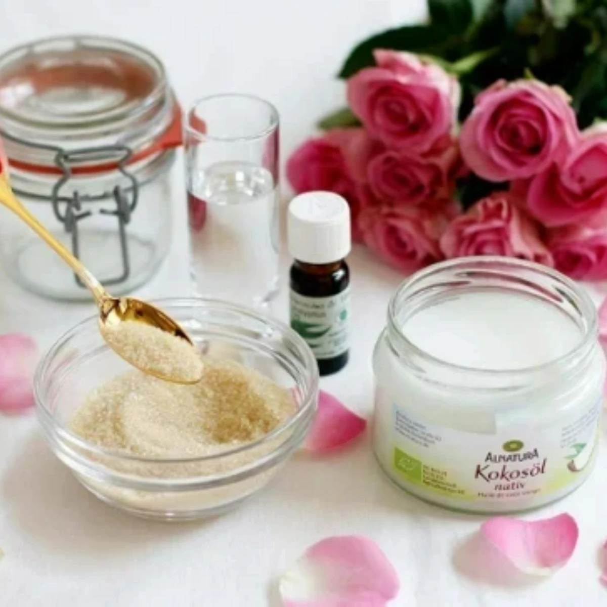 Wer sagt denn, dass es zum Muttertag nur einen Blumenstrauß geben soll. Mit dem Zuckerpeeling streuen wir der besten Mama Rosen, befreien ihre Haut von kleinen Schüppchen und hinterlassen sie zart gepflegt.