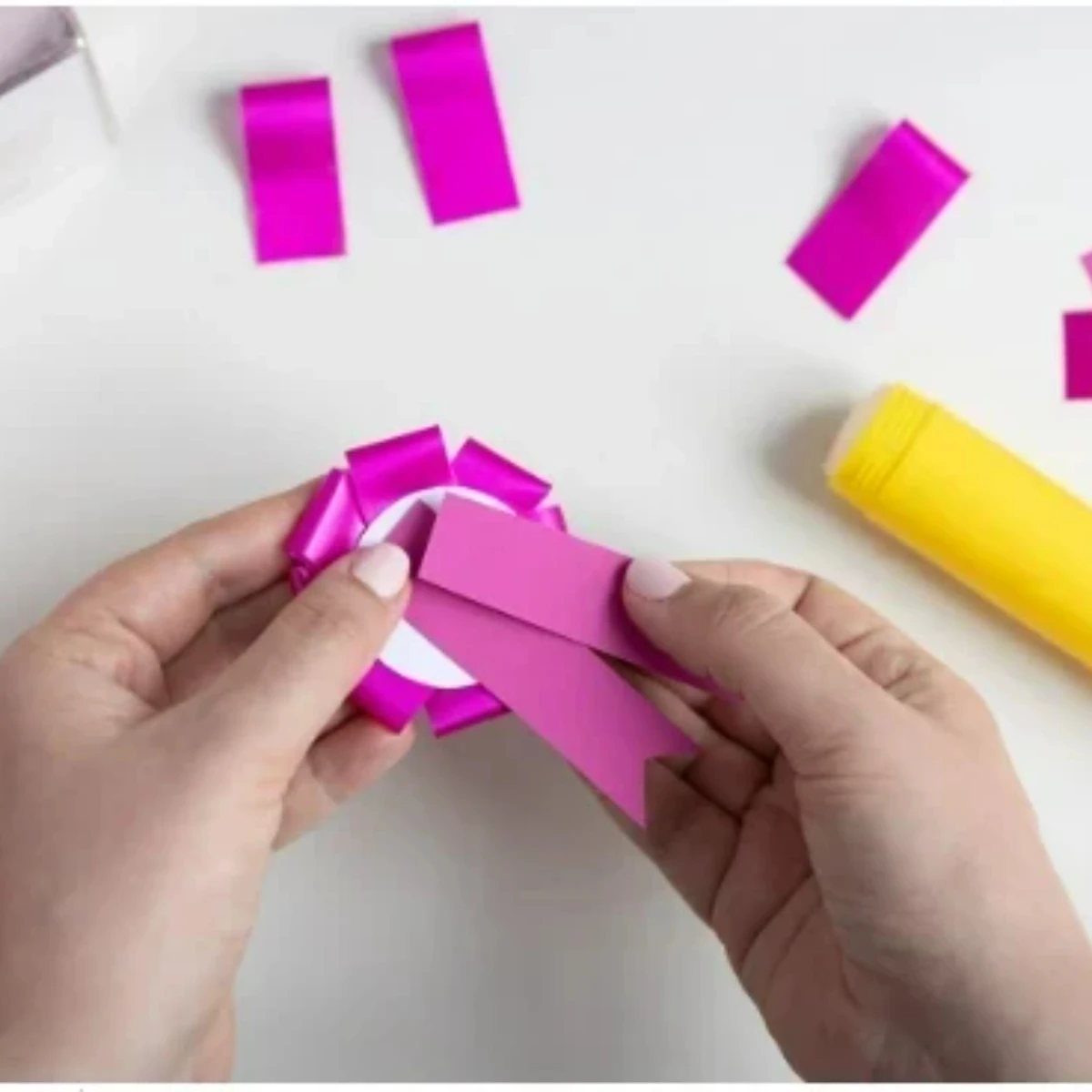 - Die Basis des Abzeichens bildet jedoch der andere große Kreis. Daran werden nämlich ringsum die – in unserem Fall pinken – Schlaufen aufgeklebt.