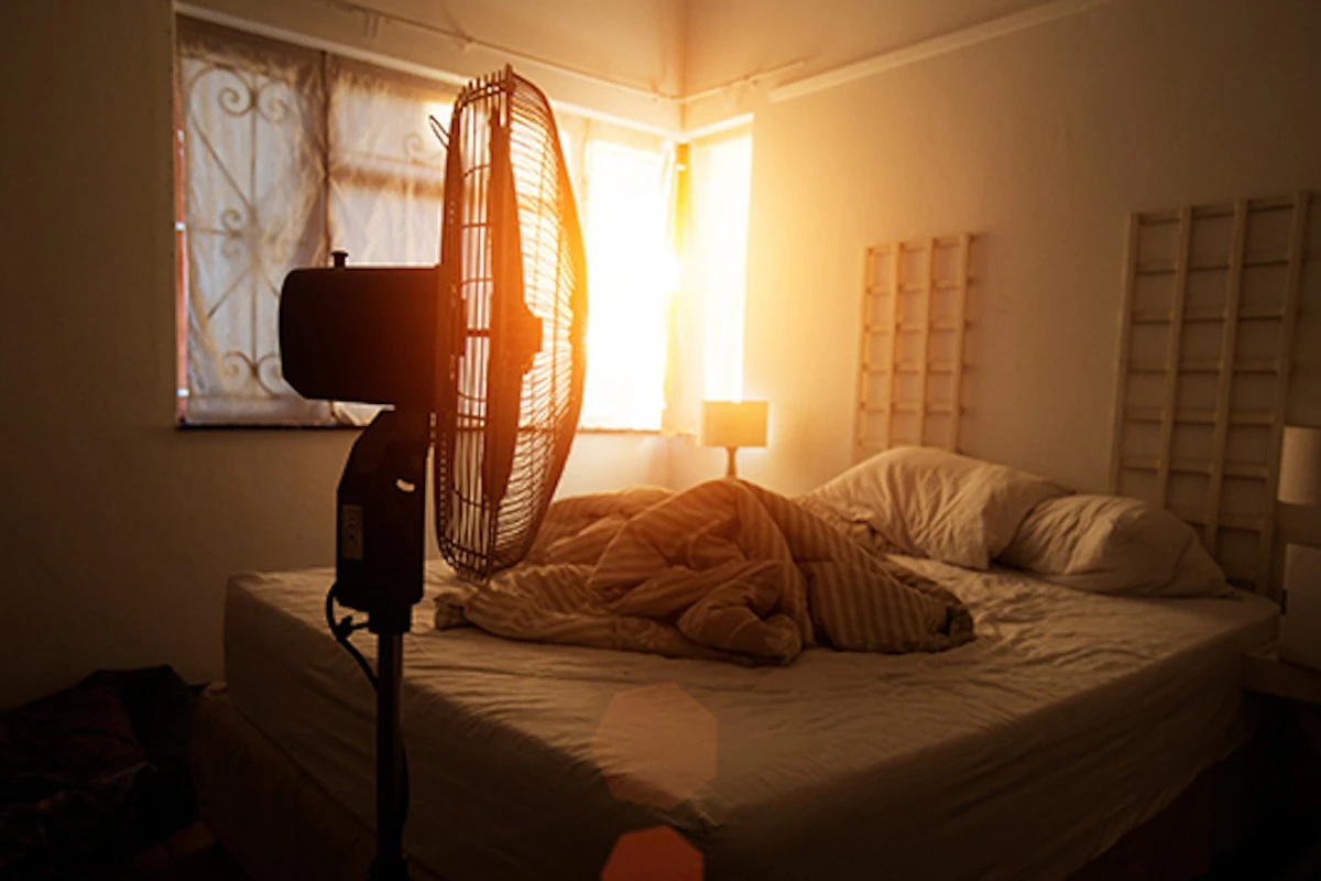 Natürlich ist es schön, wenn die Sonne in das Zimmer scheint, aber die angestaute Wärme verwandelt das Schlafzimmer schnell in einen Hexenkessel. Schließen Sie tagsüber alle Fenster in der Wohnung und ziehen Sie die Vorhänge zu. Dadurch bleibt die Wohnung zumindest ein paar Grad kühler. Wer es gar nicht aushält, sollte sich überlegen, in eine Klimaanlage zu investieren, oder einen Ventilator aufstellen. Achtung: Dieser darf Sie auf keinen Fall direkt anblasen, sonst wachen Sie mit einem steifen Nacken oder einer Verkühlung auf.