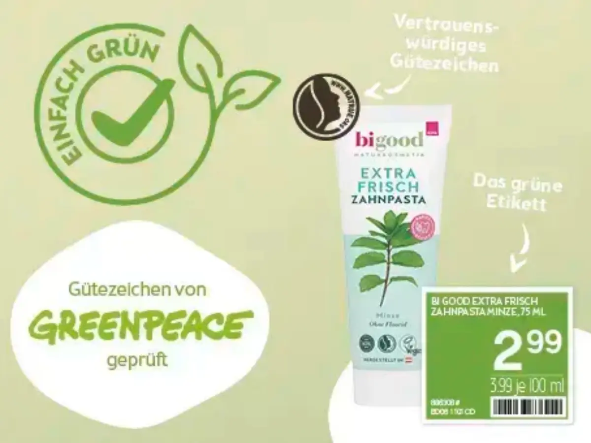BIPA: Die Umwelt ist uns ein großes Anliegen. Daher möchten wir es unseren Kundinnen und Kunden nun noch einfacher machen, grüne Produkte einzukaufen. Die grüne Kennzeichnung soll Orientierung bieten, da nur Produkte mit mindestens einem Gütezeichen, das von Greenpeace im Gütezeichen-Guide als vertrauensvoll bewertet wurde, ein grünes Etikett bekommen. Über diese Kennzeichnung machen wir es leichter, nachhaltige Produkte zu entdecken und auszuwählen. Die grünen Etiketten sind ab sofort in allen Filialen zu finden. Auch im Flugblatt werden grüne Produkte grün hinterlegt und damit speziell hervorgehoben.